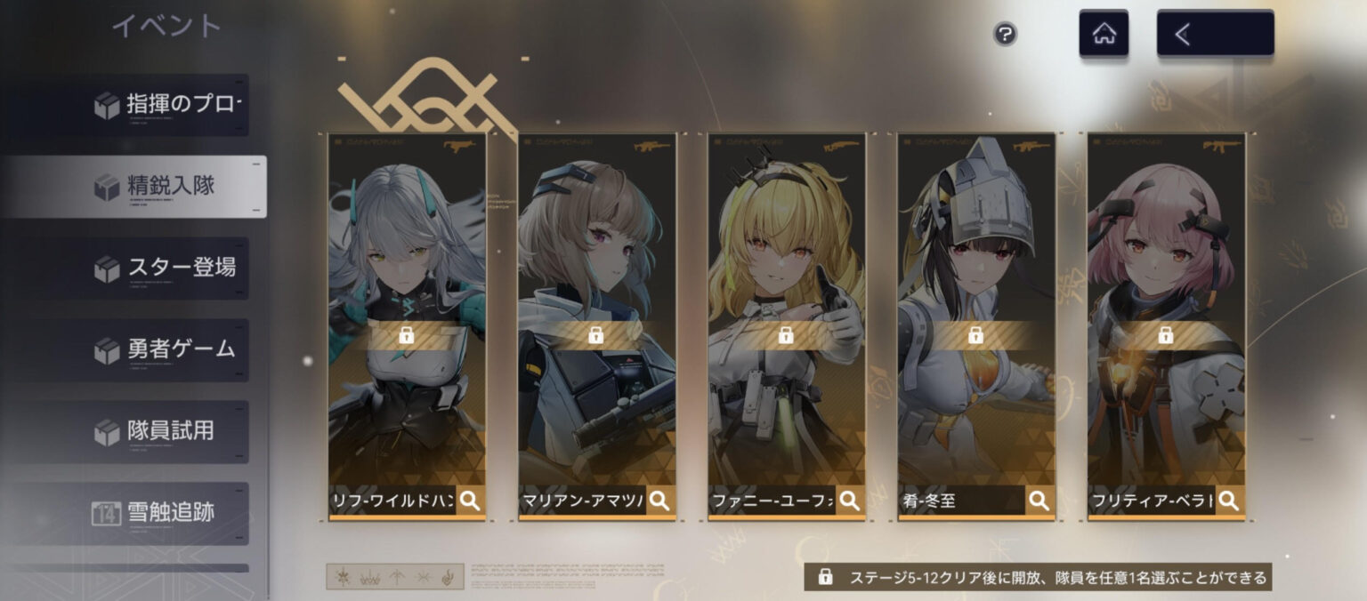 - 「精鋭入隊イベント」で好きなオレンジランクキャラを1体選択可能(ステージ5-12クリアで解放)