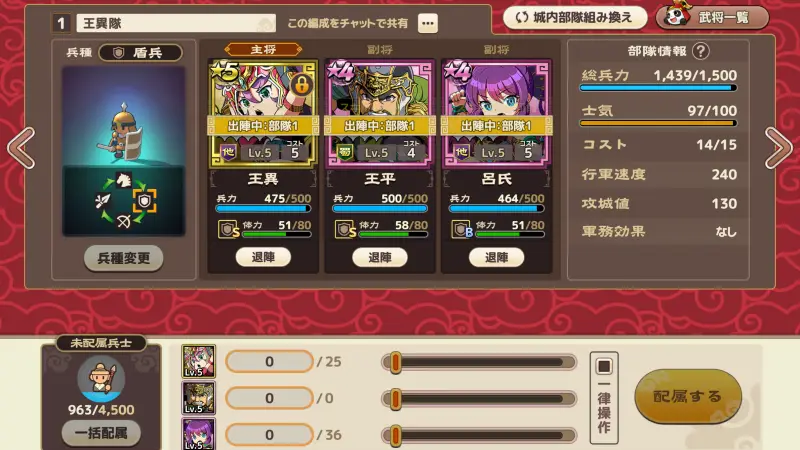 • 編成には“バランス”を意識し、攻撃型・防御型・内政支援型の武将を配分。