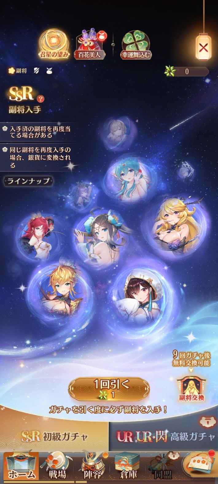 ①チュートリアル後は「召星の望み」ガチャで、SSR・UR・UR閃の副将を入手。